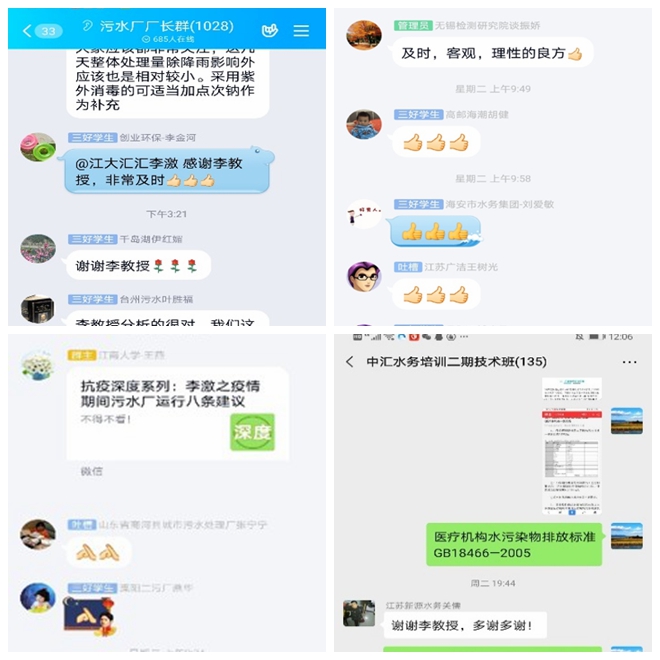 教师以身作则,始终牢记初心使命,发挥专业优势指导疫情期间污水厂、排水公司等的正常安全运行,用实际行动抗击疫情。李激教授的专业建议在国内排水行业群中也受到了好评。