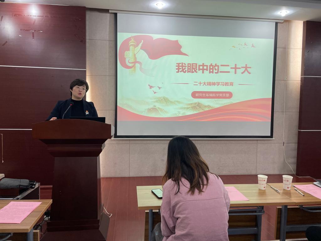 严普认为党的二十大是今年党和国家政治生活最重要的一件事,受到国内国际广泛关注,我们需要深入学习贯彻党的二十大精神,深刻理解习近平总书记的二十大报告,从自身做起,担负起新时代的重任。研究生环境科学党支部书记王芮引用二十大报告中的环境论述,详细讲解了新时代高质量发展方式的绿色转变,要尊重自然,顺应自然,保护自然,加快发展方式绿色转型。支部宣传委员季亚卉从坚守党员初心,时刻进行自我革命角度,强调入党是需要我们用一生去践行党员标准的过程。各年级代表也将自己关于党的二十大精神学习成果向大家进行了分享。分享交流后严普带领支部党员进行了二十大报告论述知识问答并阐述问题背后的内在含义。
