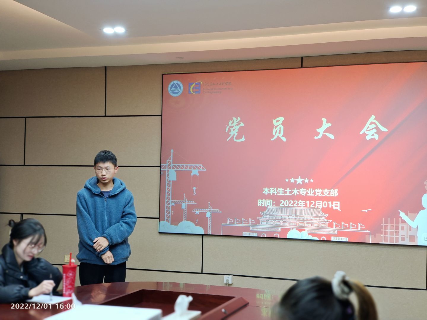 环境与土木工程学院本科生土木专业党支部于学院楼D305会议室召开了支部大会,讨论预备党员转正。党支部全体党员参加本次会议,支部书记何涛主持会议。会议严格按照规定的程序进行。