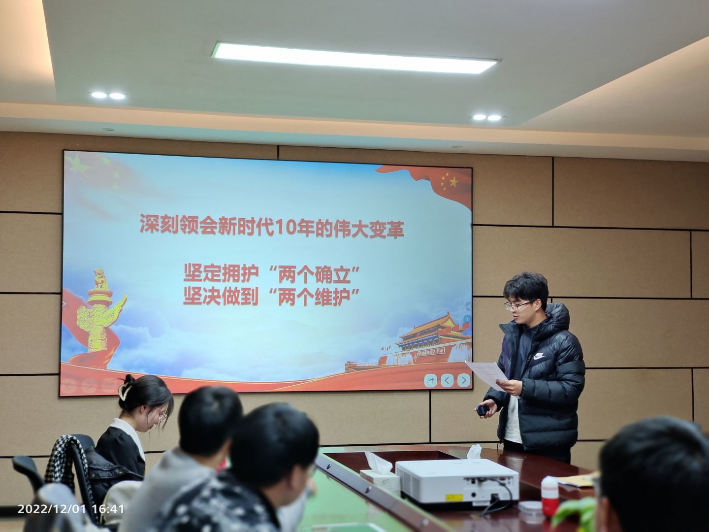 郑仲同志带领全体支部成员进行理论学习,深刻领悟党的二十大精神统一思想和行动。党的二十大对青年学子提出了“立志做有理想、敢担当、能吃苦、肯奋斗的新时代好青年”的期望和要求,青年党员要深刻领会,勇于担当尽责,埋头苦干,矢志拼搏奋斗,将青春融入党和人民的事业,在新征程上承担历史使命和时代责任。