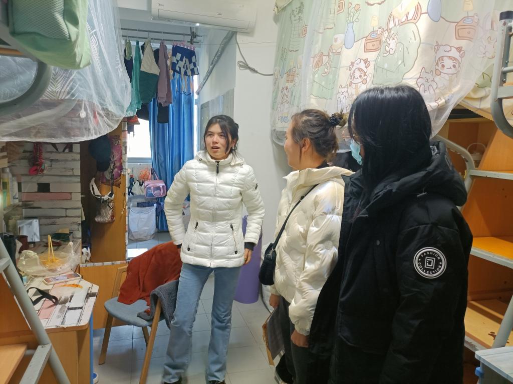 走访中,三位老师详细了解了少数民族学生的学习生活情况和家庭情况。首先走访了学生食堂,了解关心了学生在校期间的饮食生活状况,学生们表示学校食堂味道、价格等方面都挺满意。然后走访了学生宿舍,细致查看了学生宿舍的环境卫生状况,提醒学生注意宿舍用水用电安全,严禁使用违规电器,提醒同学们要提高安全防患意识,多开窗户勤通风,做好个人卫生和疫情防护工作。最后三位老师鼓励同学们坚定信心,自立自强,合理安排学习生活,遇到困难及时向辅导员老师寻求帮助,争做民族团结模范标兵,学好科学文化知识,练强本领,认真准备期末考试,努力实现个人的全面发展。