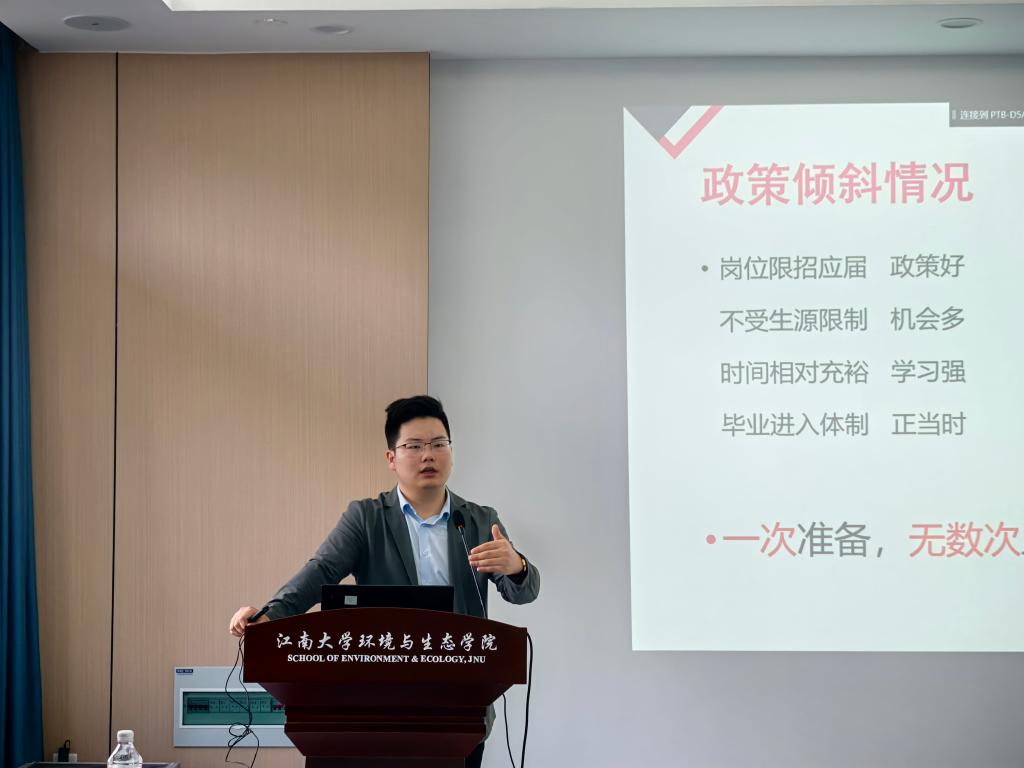 讲座伊始,吕老师以其深厚的行业洞察力与丰富的实战经验,系统性梳理了近几年公务员招录趋势,将国考、省考、选调生等相关职业发展通道、薪酬福利梯度及岗位招考类别清晰呈现。针对"应届生身份有效期""基层服务年限"等高频疑问,吕老师以2024年度公考最新政策为例,选取江苏、山东、浙江三省招录公告进行分析回答。随后,吕老师以详实数据为切入点,向同学们介绍了我校近几年各学院学生公考录取情况并通过与江苏省内其他高校录取数据对比分析,强调“精准选岗”的重要性,他建议学生优先考虑限制条件多、招录人数多的选调生岗位。此外,吕老师围绕岗位选择、报考策略等关键环节,并结合在校生的实际情况,提出了一套基于科学备考原则与时间管理理论的个性化备考方案与建议。