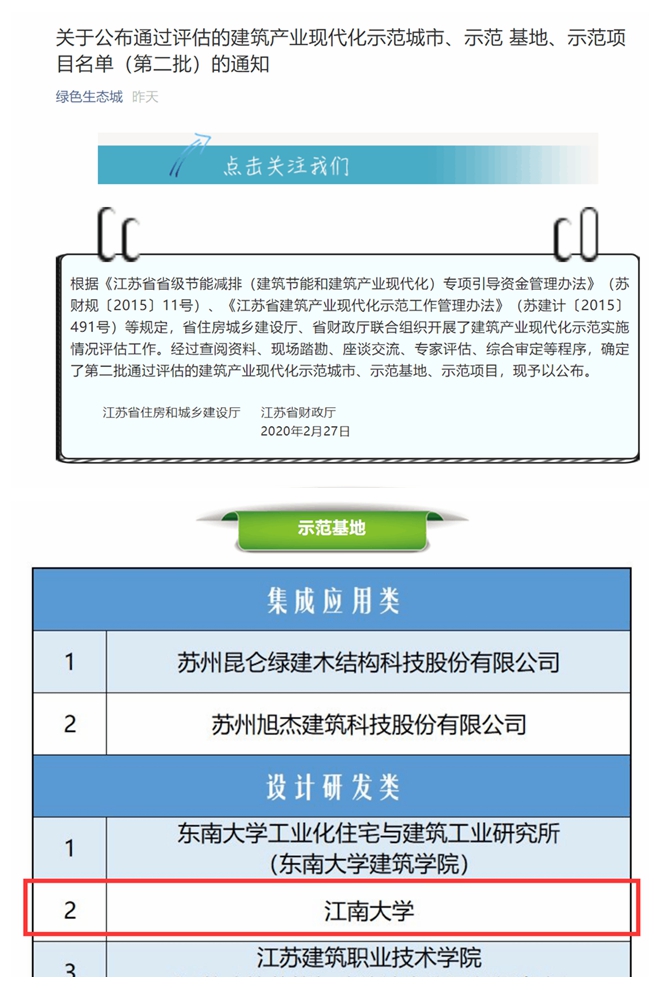 2月27日,江苏省住房和城乡建设厅、江苏省财政厅公布的通过评估的建筑产业现代化示范城市、示范基地、示范项目名单(第二批),经过2016—2019年四年的建设,91网站 获批江苏省装配式建筑设计研发类示范基地,该项目由环境与土木工程学院邹昀教授主持。