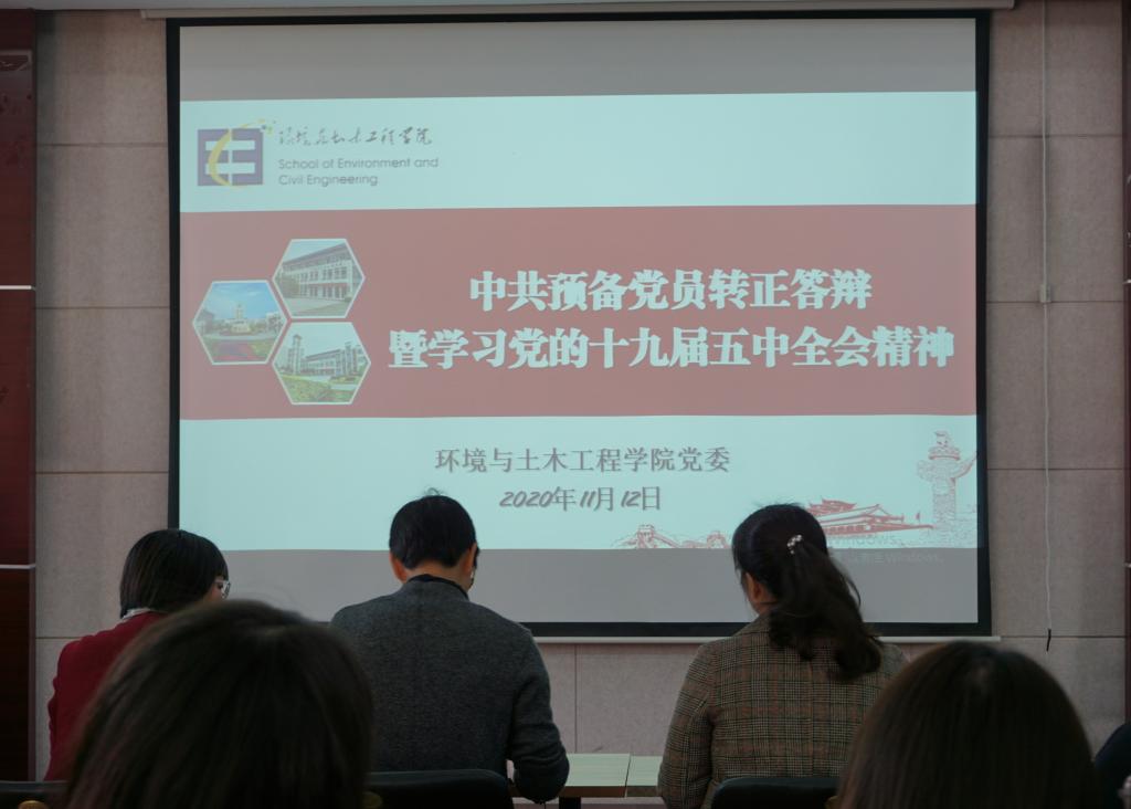 为进一步完善学生预备党员考察机制,切实发挥学生党员先锋模范作用,深入学习党的十九届五中全会精神,11月13日下午,环境与土木工程学院举行本学期预备党员转正答辩会暨学习党的十九届五中全会精神。院党委书记李艳,副书记胡娟,院党委秘书沈炎,辅导员周佳赟、薛羚伟、何涛、邵冰洁、周盼盼担任答辩评委,下半年拟转正预备党员参加会议,各支部其他党员、部分入党积极分子列席会议。