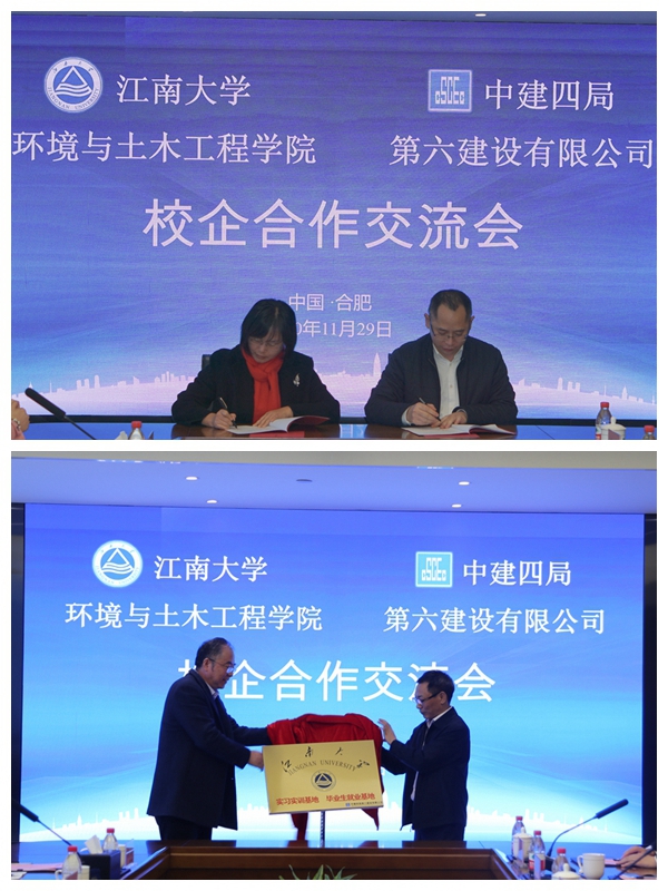 11月29日下午,环境与土木工程学院-中建四局第六建设有限公司校企合作签约仪式在公司总部合肥中建大厦举行。中建四局第六建设有限公司党委副书记、工会主席徐玉发,党委委员、董事、总会计师郑国庆,党委委员、董事、总经济师曹延强,党委委员、董事、安徽分公司党委书记、总经理丁云朝,人力资源部经理李侠,上海分公司党总支副书记、工会主席车其杰,上海分公司人力资源部经理陆强,91网站