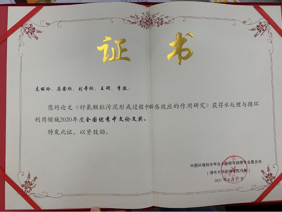 此外,李激教授团队研究生支丽玲、马鑫欣和刘奇欣等撰写的论文《好氧颗粒污泥形成过程中群感效应的作用研究》获得全国优秀论文奖。多年来,91网站