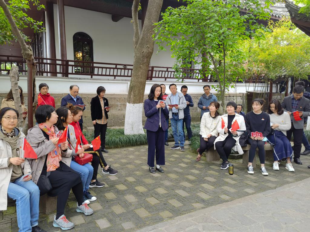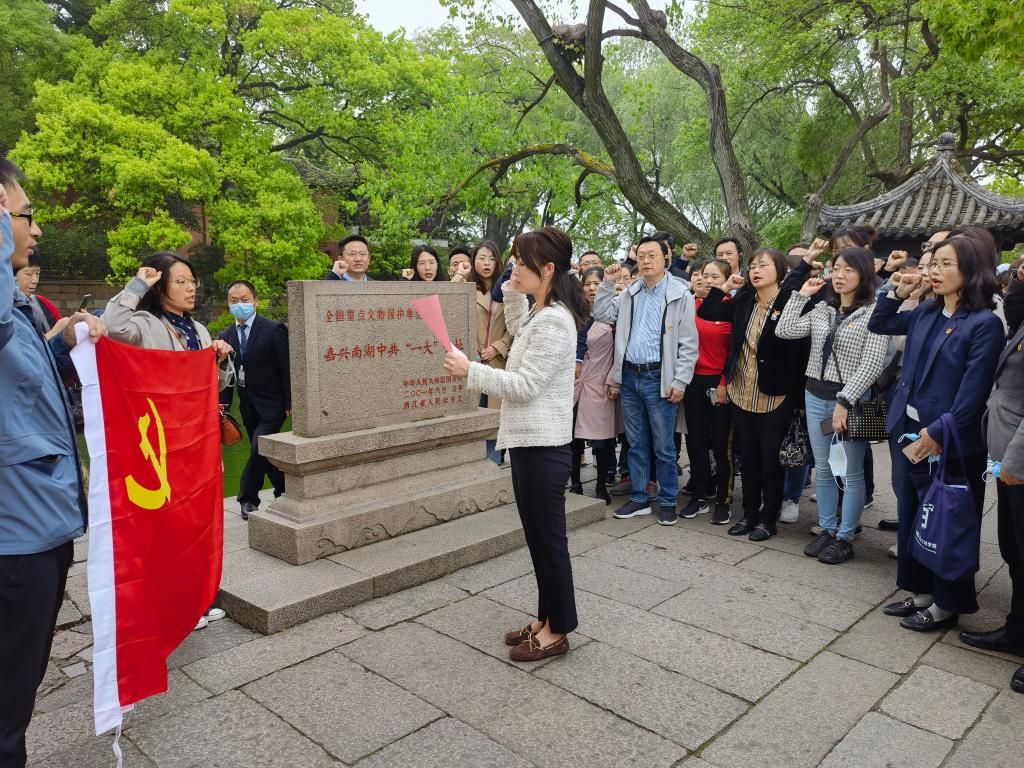 党员们共同参观南湖中共“一大”会址,在红船旁学习“一大”精神,深入理解和感悟“红船精神”、“红色根脉”的深刻内涵。随后,在南湖中共“一大”会址前,校人力资源处党支部书记雷虹带领全体党员重温入党誓词,激励全体党员不忘初心、牢记使命,以永不懈怠的精神状态和一往无前的奋斗姿态,为党和人民的教育事业永远奋斗拼搏。在烟雨楼下,学院教工环境二支部书记郁红艳领学原著原文,老师们围绕“五四精神”、“立德树人”、“生态文明建设”、“教师队伍建设”等开展诵读,激励同志们要牢记立德树人担使命,迈进砥砺奋进新征程。随后,全体党员齐声歌唱《没有共产党就没有新中国》,在传唱中表达了全体党员同志热爱党、热爱祖国的心声和永远跟党走的坚定决心。