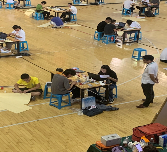 本次比赛分模型展示组和加载组两个竞赛单元,展示组要求在给定的尺寸范围内自主设计并制作一个结构模型,注重结构创新和受力合理;加载组命题源自国赛赛题,要求现场设计制作一座竹质小桥,分三级进行加载,分别模拟桥梁所承受的随机分布荷载、严重偏载和移动荷载;小桥质量越轻、承受的荷载越大则得分越高。我省共有36所高校参与本次比赛,其中,模型展示组和加载组分别有57件和31件作品参与评比。在模型展示单元,我校学生柴纪龙、邱叶凡和黄诗怡完成的作品“煋”以全场最高分获得特等奖;张志强、黄子叶和饶文威完成的作品“空”获得一等奖。在模型加载单元,根据现场抽取的荷载工况,王姝涵、陈孙龙和姜韬三位同学在16个小时内完成了对桥梁结构的设计与制作,并顺利通过全部三级荷载,最终获得二等奖。