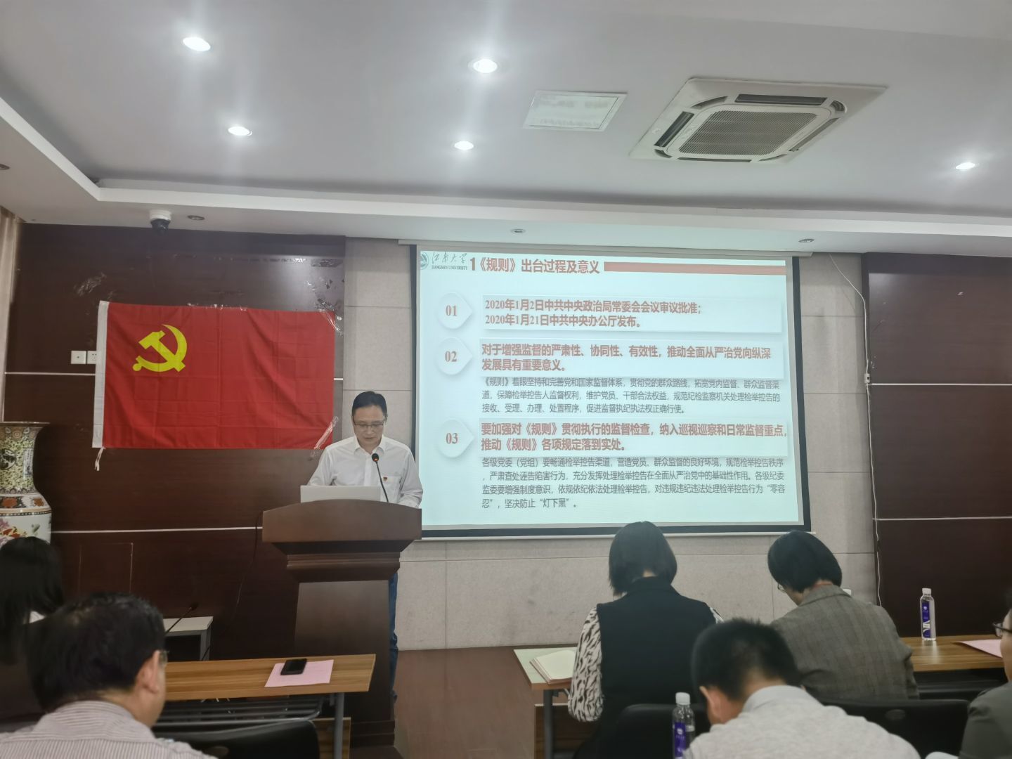 院党委纪委委员邹华同志就《纪检监察机关处理检举控告工作规则》做了详细介绍。他说,处理检举控告,是我们党倾听党员和群众呼声、依靠人民群众开展反腐败工作的重要方式,是纪检监察机关贯彻党的群众路线、保障党员民主权利的重要举措;《规则》将坚持和加强党的统一领导作为根本政治要求,营造党员和群众监督的良好环境;要充分发挥处理检举控告在全面从严治党中的基础性作用,提倡鼓励实名检举控告、严肃查处诬告陷害行为、依规依纪依法处理检举控告。他指出,依据《规则》,开展常态化监督,落实党要管党,全面从严治党要求。