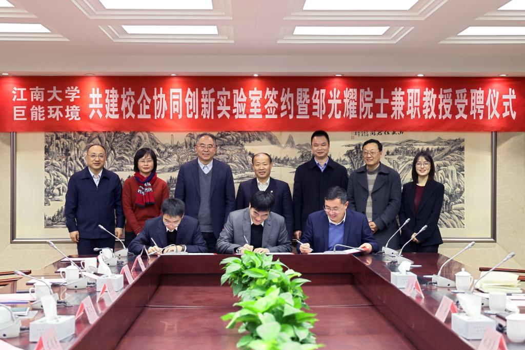 —巨能环境共建校企协同创新实验室签约暨邹光耀院士兼职教授受聘仪式。浙江巨能环境工程有限公司总经理凌明、副总经理姚海勇、郭慧,91网站