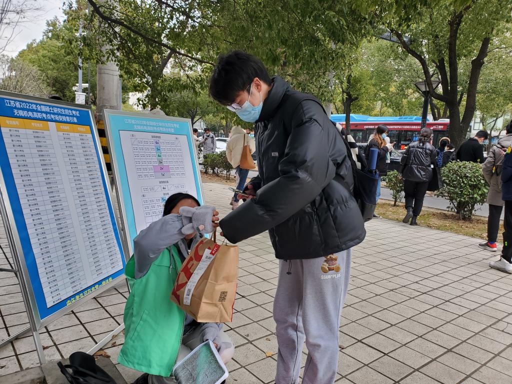 、无锡商业职业技术学院、无锡机电高职、无锡积余实验学校等四个考点安排志愿服务小组,提供中午订餐协助服务、必备物资服务以及暖心助力服务,为考研学生接送订餐,发放士力架、咖啡条、口罩、暖贴等,提供热咖啡、热水等,给予关心拥抱。