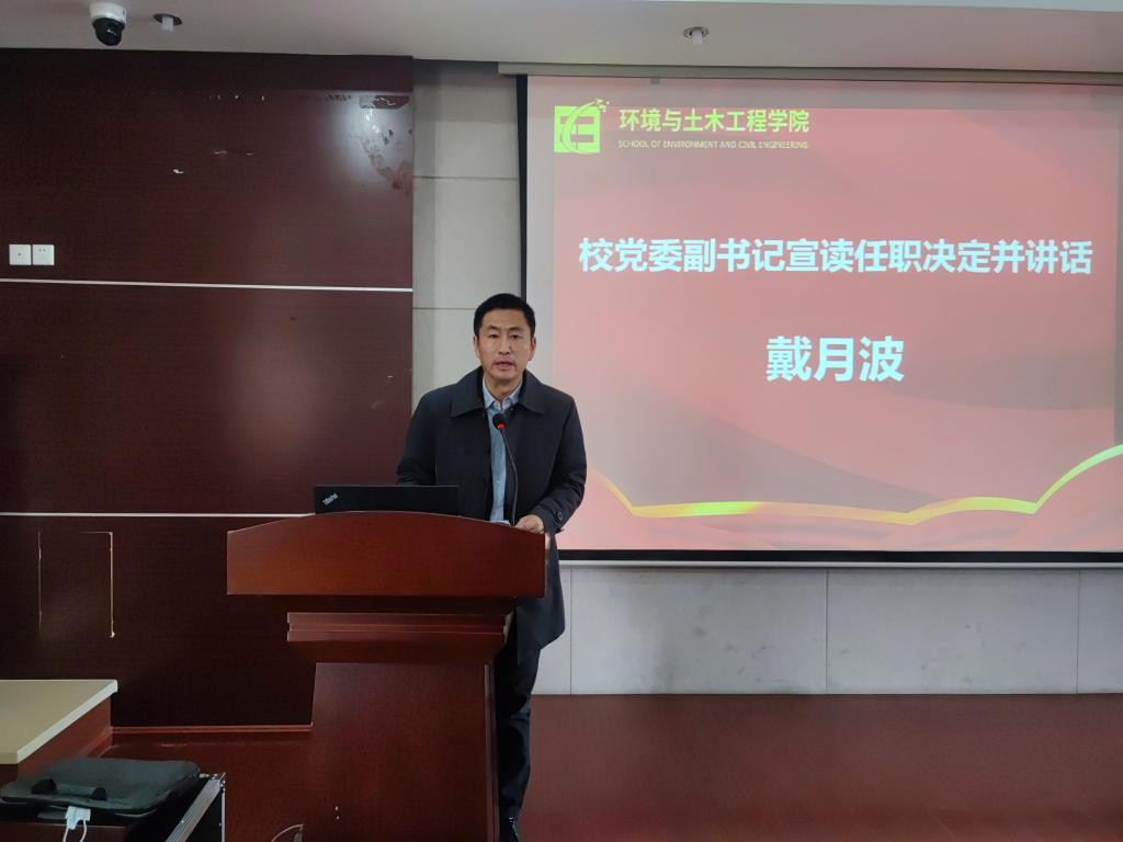 戴月波宣读了学校党委关于李艳同志、王震宇同志的职务任职决定,任命李艳同志为环土学院党委书记、王震宇同志为环土学院院长。戴月波在随后的讲话中指出,这次中层干部的换届调整,既是学校干部任期目标责任制的例行工作,也是优化班子结构、促进改革发展的一项重要举措。他对环土学院上一届党政班子在2020-2022年任期中取得的成绩表示高度肯定,对于全体教职工共同努力表示衷心感谢。对新一届领导班子提出了四点要求:一是要旗帜鲜明讲政治,强化党政同责、一岗双责意识。二是要敢于担当善作为,要抢抓发展机遇,前瞻思考、主动作为,努力开辟发展的新领域新赛道,不断塑造发展新动能新优势。三要团结协作聚合力,牢固树立“一盘棋”思想,围绕中心工作,密切配合、通力协作,形成上下齐心谋发展的良好格局。四要以身作则当表率,领导干部要身体力行、以身作则,充分发挥示范表率作用,凝聚干事合力。