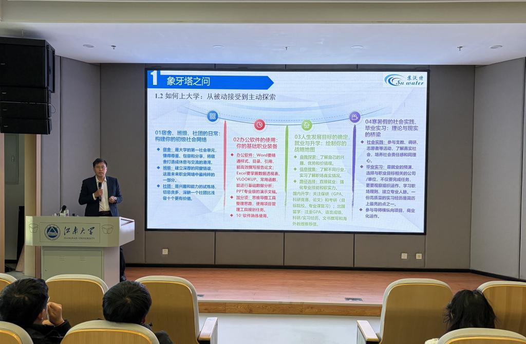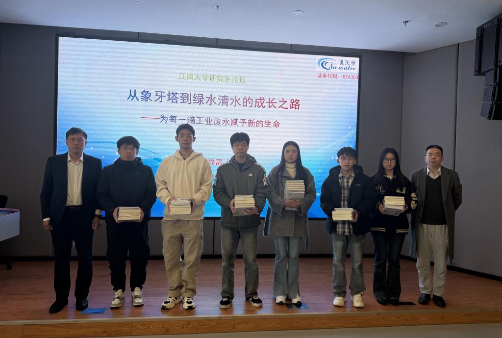 2025年研究生学术文化节暨“江南讲坛”校庆专场第一百六十六讲在东氿校区成功举办。本次讲坛荣幸邀请到学院2014届杰出博士校友、苏州苏沃特环境科技股份有限公司创始人、正高级工程师徐富博士重返母校,以“从象牙塔到绿水清水”为题,从科研经验到人格塑造,为到场师生带来了一场启迪思想、引领规划的学术盛宴。