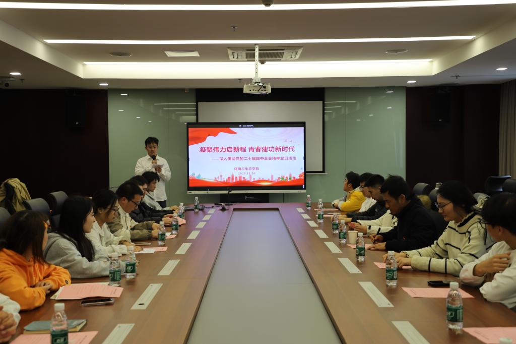 活动在集体观看主题短片《以青春之我,赴时代之约》中拉开帷幕。短片以青年视角展现了新时代的使命召唤,引发与会党员的强烈共鸣。随后,支部党员钱启隆同志以《红心向党绿为卷,美丽中国我先行》为题领学党的二十届四中全会精神、美丽中国建设战略部署及青年党员使命担当。他围绕“绿水青山就是金山银山”、“山水林田湖草沙是生命共同体”等生态文明理念解读了新时代推进生态系统保护修复、构建自然保护地体系、生物多样性保护等重点任务。同时,他结合自身研究方向,倡导青年党员将学习成果落实到实际行动中,从坚持“光盘行动”、减少外卖包装到组织集体生态实践,全方位践行绿色理念。