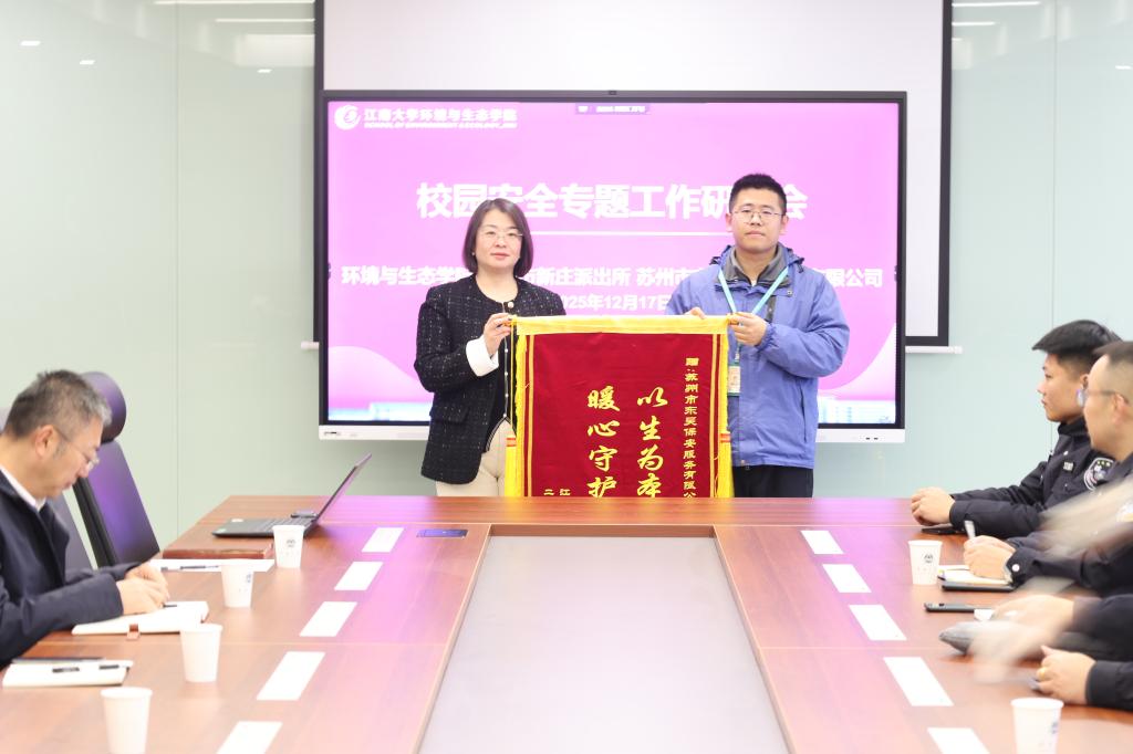 会议伊始,现场举行了庄重的锦旗颁发仪式。学院党委杨延首先向宜兴市新庄派出所代表孙福平颁授锦旗,对公安机关为维护学院安全稳定所付出的辛勤努力与展现出的担当精神致以崇高敬意和衷心感谢。随后,胡娟向苏州市东吴保安服务有限公司代表吴伟彬颁授锦旗,对其专业、敬业的服务保障工作表示充分肯定。两面锦旗承载着学院全体师生的深厚谢意,也见证了校地同心协力、共护平安的深厚情谊。
