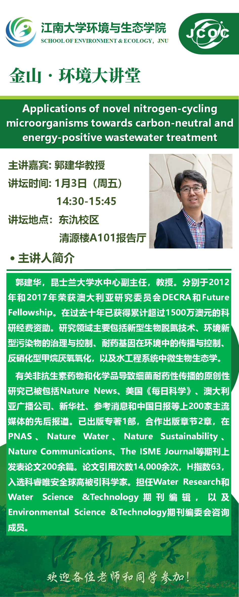 金山•环境大讲堂—郭建华:Applications of novel nitrogen-cycling microorganisms towards carbon-neutral and energy-positive wastewater treatment