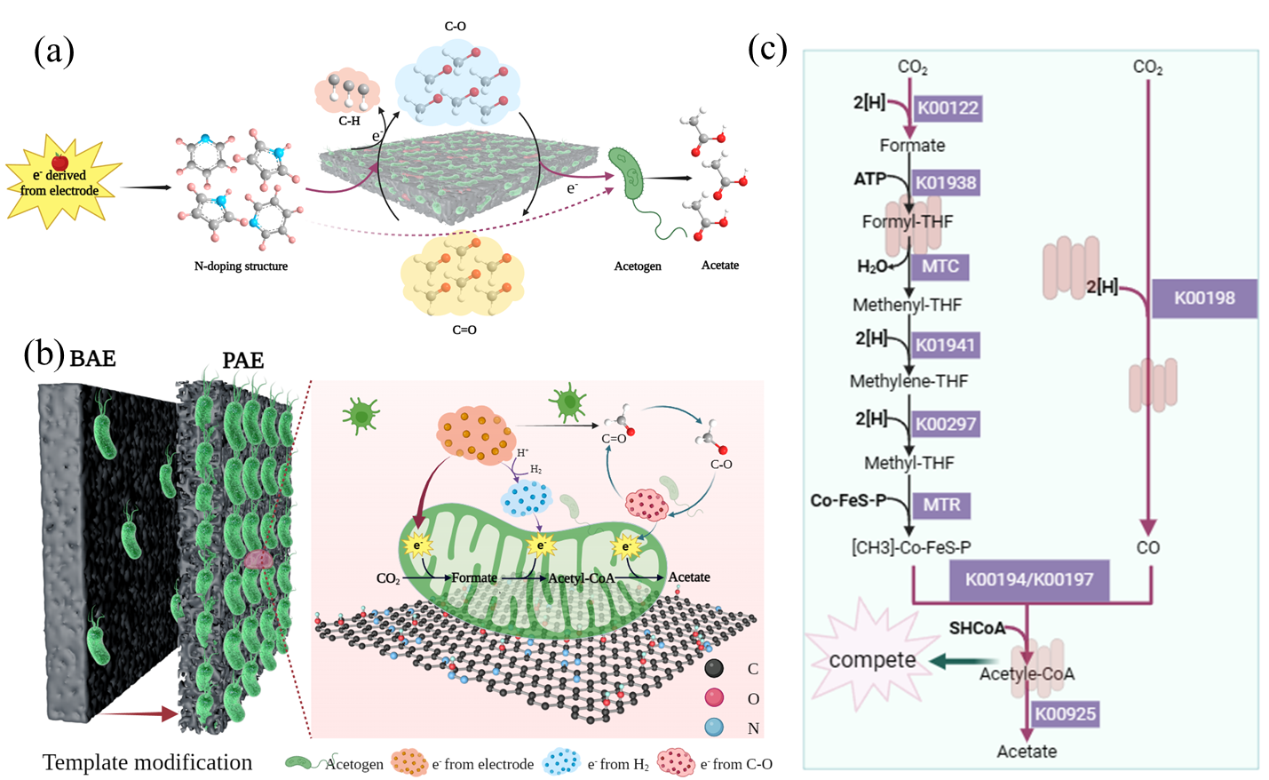 在全球“双碳”目标的背景下,微生物电合成技术(Microbial Electrosynthesis, MES)因其可以通过功能微生物(如同型产乙酸菌)捕获阴极电子,将CO₂还原为乙酸等高附加值化学品而备受关注。该技术具有反应条件温和、产品选择性高等优点,因此在二氧化碳减排和高附加值化学品生产领域展现出巨大应用潜力。然而,现有阴极材料因孔隙结构不完善、电催化效率较低,导致电极与微生物之间的电子传输效率受限,制约了MES技术的进一步推广。